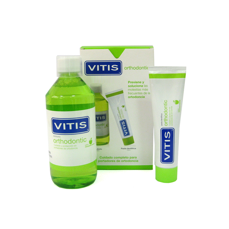 Colutorio Vitis ortodoncia 500 ml del pack colutorio 500 ml y pasta dentífrica 100 ml Vitis ortodoncia con acción antiplaca y remineralizante del esmalte, proporciona diariamente los principios activos necesarios para mantener una boca sana.