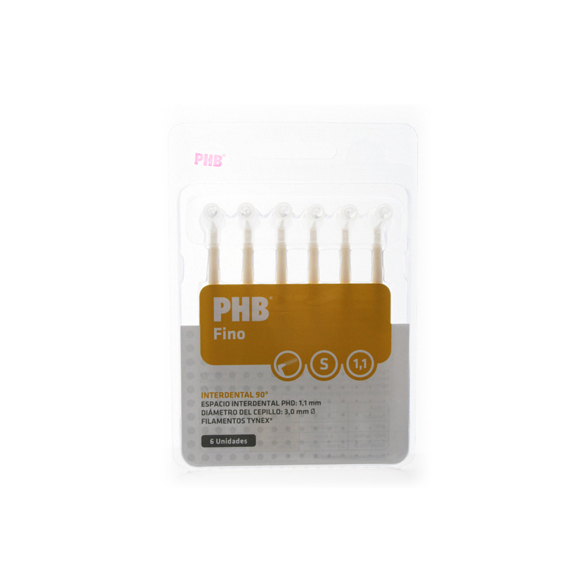 Los interdentales PHB 90º están indicados para limpiar de manera eficaz los espacios interdentales posteriores gracias a su mango curvado. Sus filamentos son de Tinex, los de color negro sirven para ver la presencia de placa y los blancos nos alertan de un posible sangrado de la encía. Su capuchón protector lo aísla de contaminaciones externas. PHD: 1.1