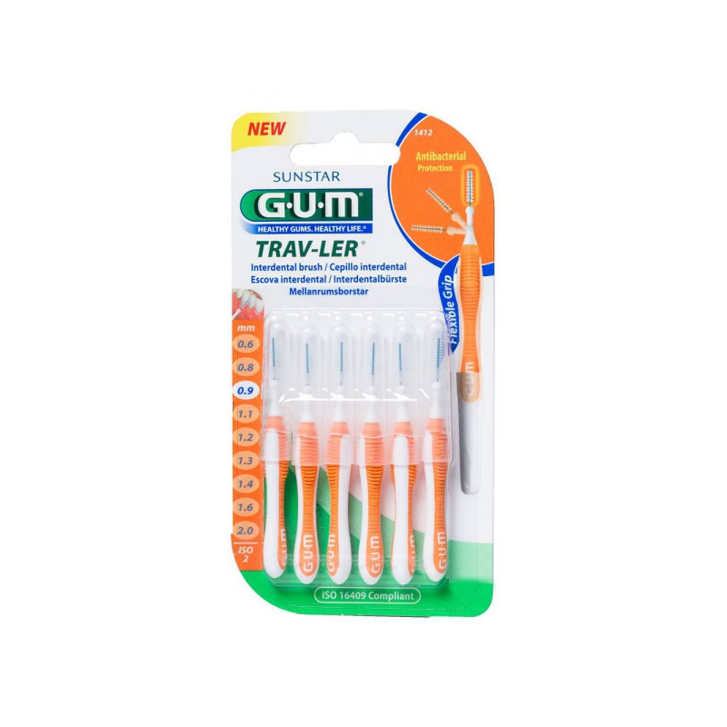 Características particulares: mango de material elastómero antideslizante de color naranja. Se dobla por el cuello para alcanzar zonas de difícil acceso. Tamaño adecuado a espacios interdentales de hasta 0.9 mm según norma ISO 2. Presentación: un blister que contiene 6 cepillos interdentales + 6 capuchones.