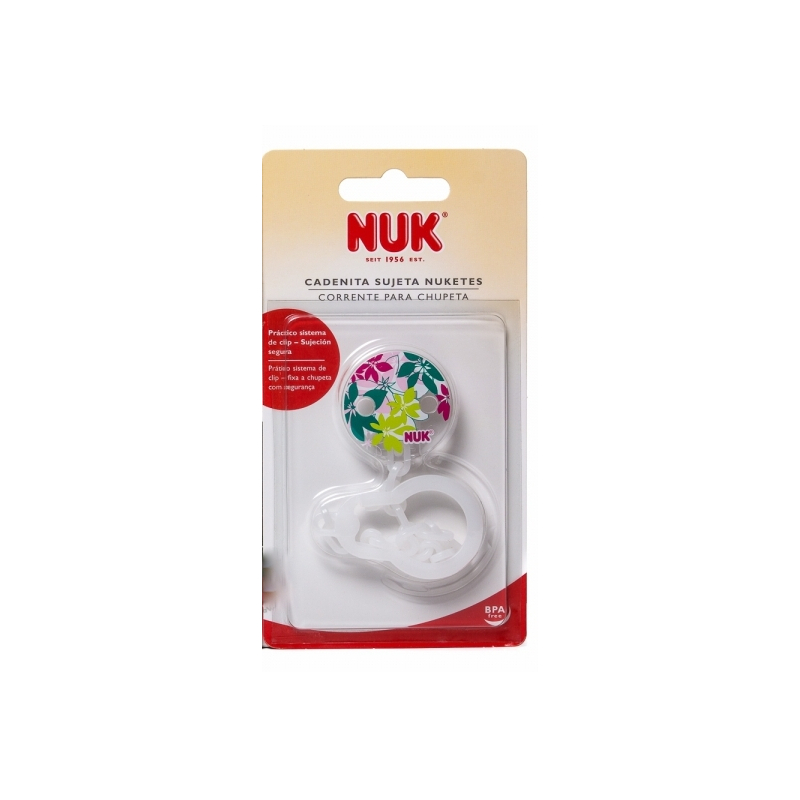 La Cadenita Sujeta Chupetes de NUK está especialmente diseñada para que el chupete permanezca en el lugar correcto y para evitar que este se caiga o se pierda.